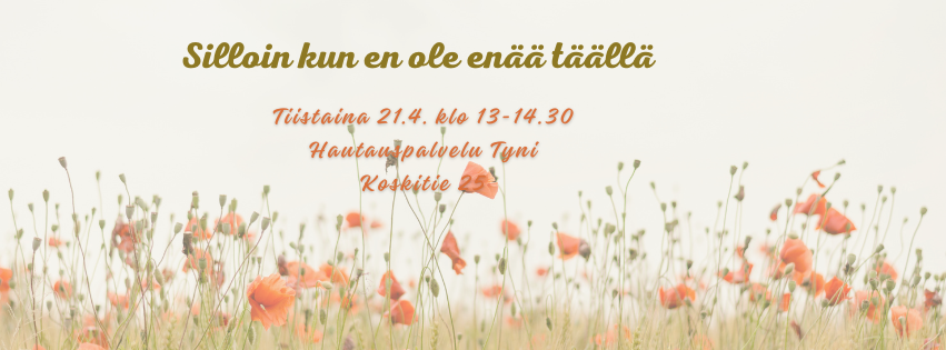 Ti 21.4. klo 13-14.30 Hautauspalvelu Tyyni, Koskitie 25, Oulu Hautajaisjärjestelyt ovat tärkeä osa omaisten ja läheisten surutyötä. On merkityksellistä, jos heidän on mahdollista tehdä päätöksiä ja…