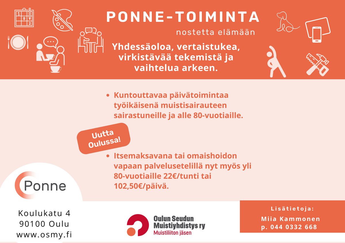 Mielekäs ja sopivasti aktivoiva tekeminen rauhoittaa mieltä ja kohentaa mielialaa. Ponne-päivätoimintaan on nyt mahdollisuus päästä myös yli 80-vuotiaiden. Päivätoimintaa voi ostaa esimerkiksi omaisen menon ajaksi omaishoidon vapaan palvelusetelillä tai itse maksavana. Kysy lisää Miialta!