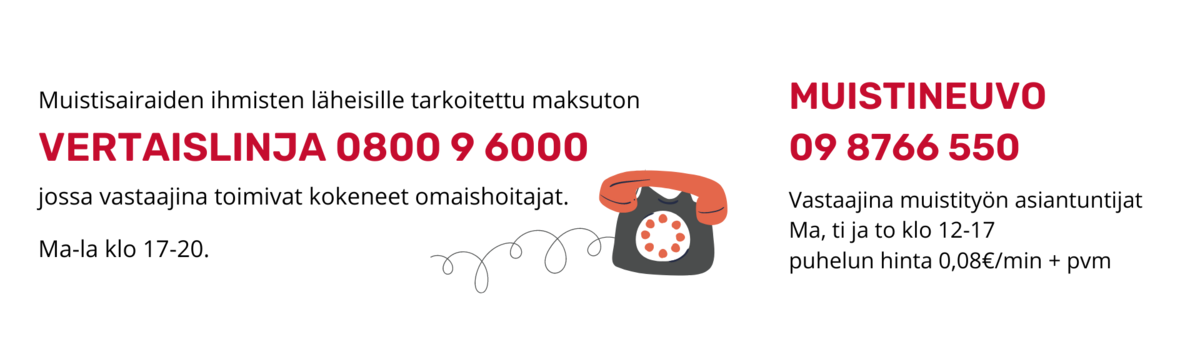 sekä Muistiliiton Muistineuvo-puhelinpalvelusta 09 8766 550. Muistineuvossa vastaavat muistityön ammattilaiset ma, ti ja to klo 12-17.