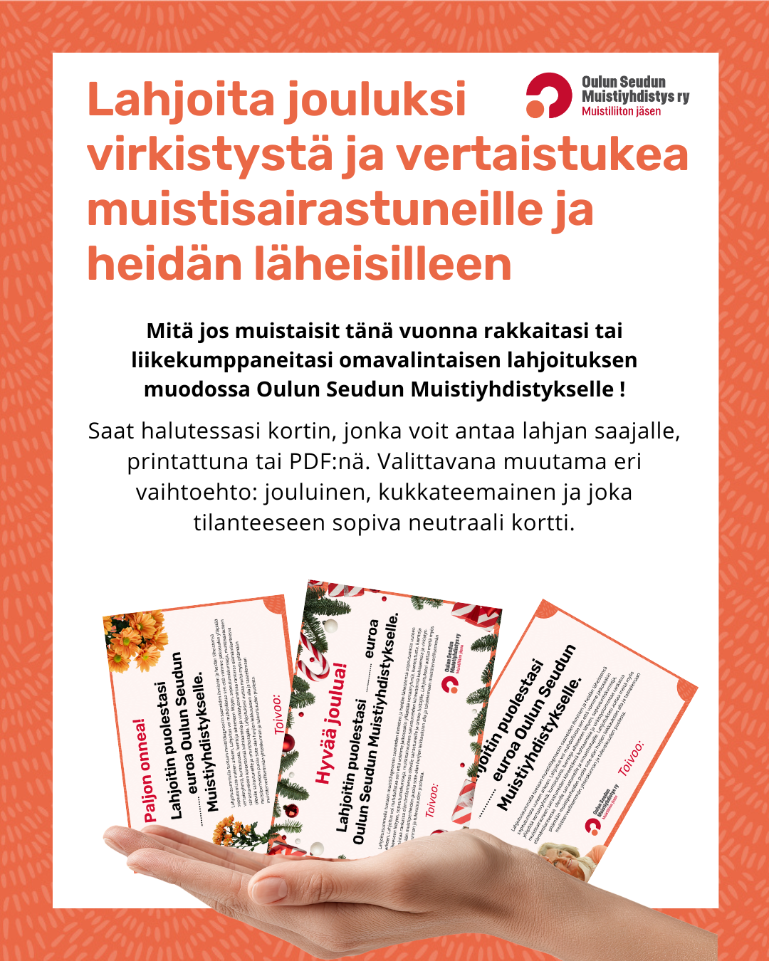 Tai tule käymään Muistiyhdistyksen toimistolla tekemässä lahjoitus, niin voit saada kortin heti mukaasi.